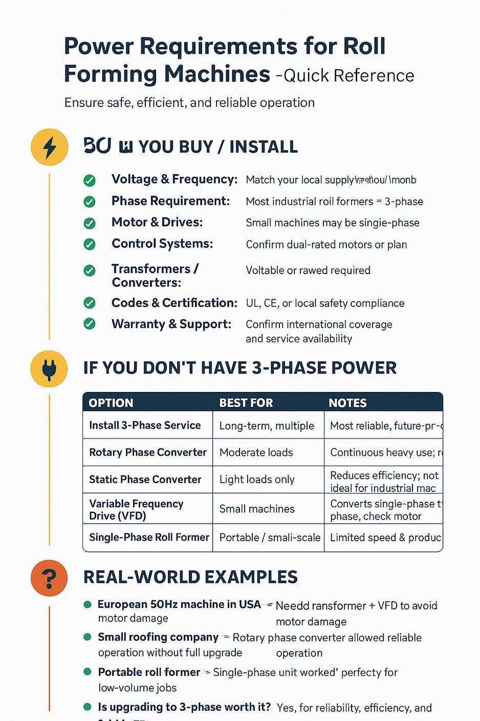Bottom line: A roll former is only as good as the power feeding it. Match your machine to the right electrical supply to protect your investment, ensure safety, and keep production running smoothly.