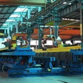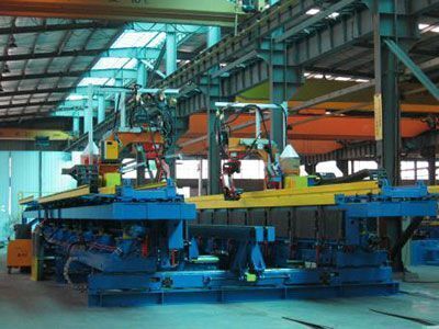 Corrugated web H-beam welding machine adopts the welding robot introduced from Italy which automatic controls the works such as whole line laser scanning, two positions welding, welding gun changing, and cross-section cutting and so on. This machine can weld the cross-section of corrugated H-beam too.