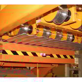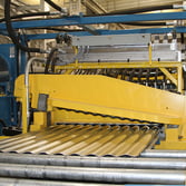 The machine is used to manufacture corrugated sidewall panels for grain bins, which are critical for storing grains securely in agricultural and commercial settings.