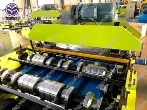 Roll forming machine | 1.Matching material:PPGI/GI/Aluminium2.Material thickness:0.2-1mm3.Power:7.5kw4.Forming speed:0-30m/min5. The width of the plates:according to the drawings6.input leveling equipment:adjustable as photos.7.Roll stations:228.Shaft Material and diameter:materialis45#steel ¢80mm, 9.Tolerance:10m±1.5mm 10.Way of drive:chain with the motor 11.Controlling system:PLC 12.Voltage,Frequency,Phase:depend on customer request 13.Material of forming rollers:45#steel heat treatment and chromed 14Materialofcutterblade:Cr12mouldsteelwith quenched treatmentHRC58-62 15. Side plate:steel plate with Chromed. |