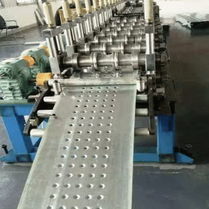 - Punching and Notching System: Hydraulic or pneumatic system for punching anti-slip holes and notches along the platform’s surface.