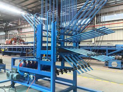 This device is used to place and store the top chord, bottom chord and web member steel bar, and feed the steel bar to the truss production line.