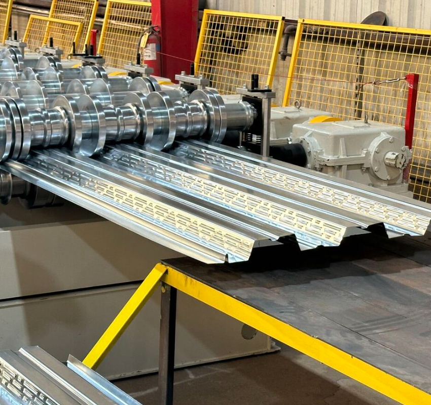 A: The machine can produce 1.5-inch B deck, 3-inch N deck, composite metal deck, steel form deck, and custom profiles designed to your specifications.